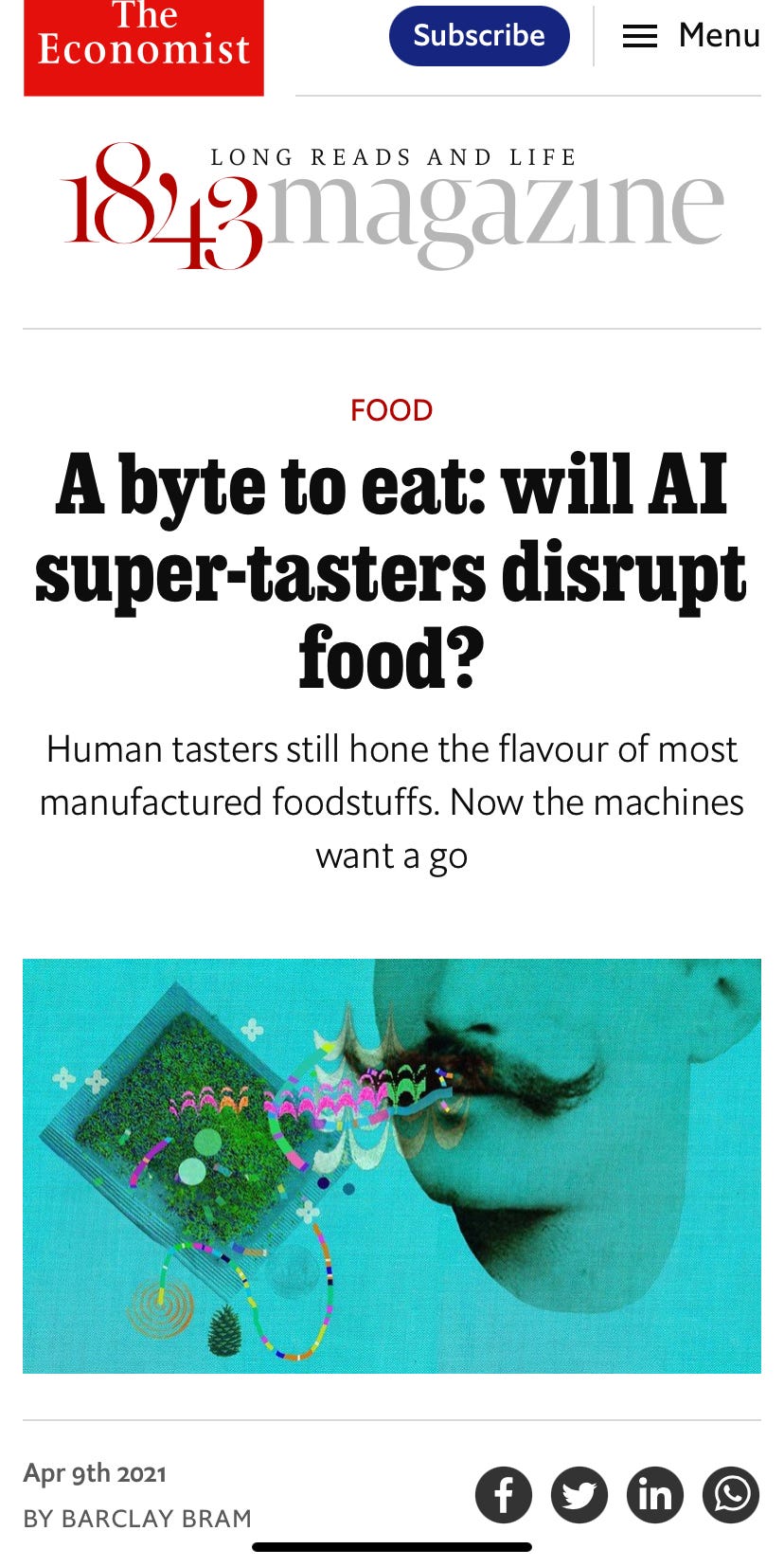 Imagine if it was possible to create a perfect digital record of a flavour. Once we understood exactly how to create a digital approximation of a flavour, the potential to create flavours as yet inconceivable could suddenly be realised. “I spoke recently to a group of perfumiers,” said Josh Silverman, the CEO of Aromyx which is a company I profile in the piece that is trying to digitise flavour. “They immediately asked me; is this going to put me out of a job? I told them that this is exactly what artists said before photoshop and what engineers said about CAD software. These tools simply help the experts do their jobs. We still have artists and we still have engineers.”